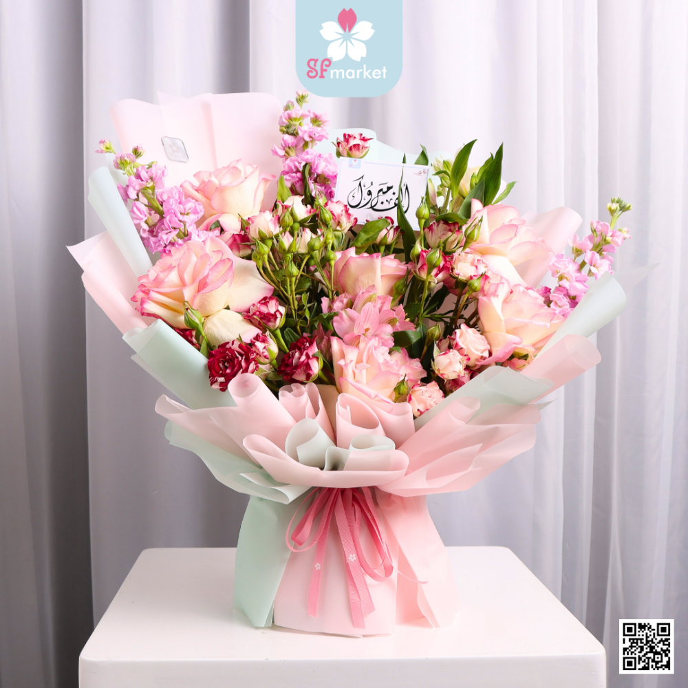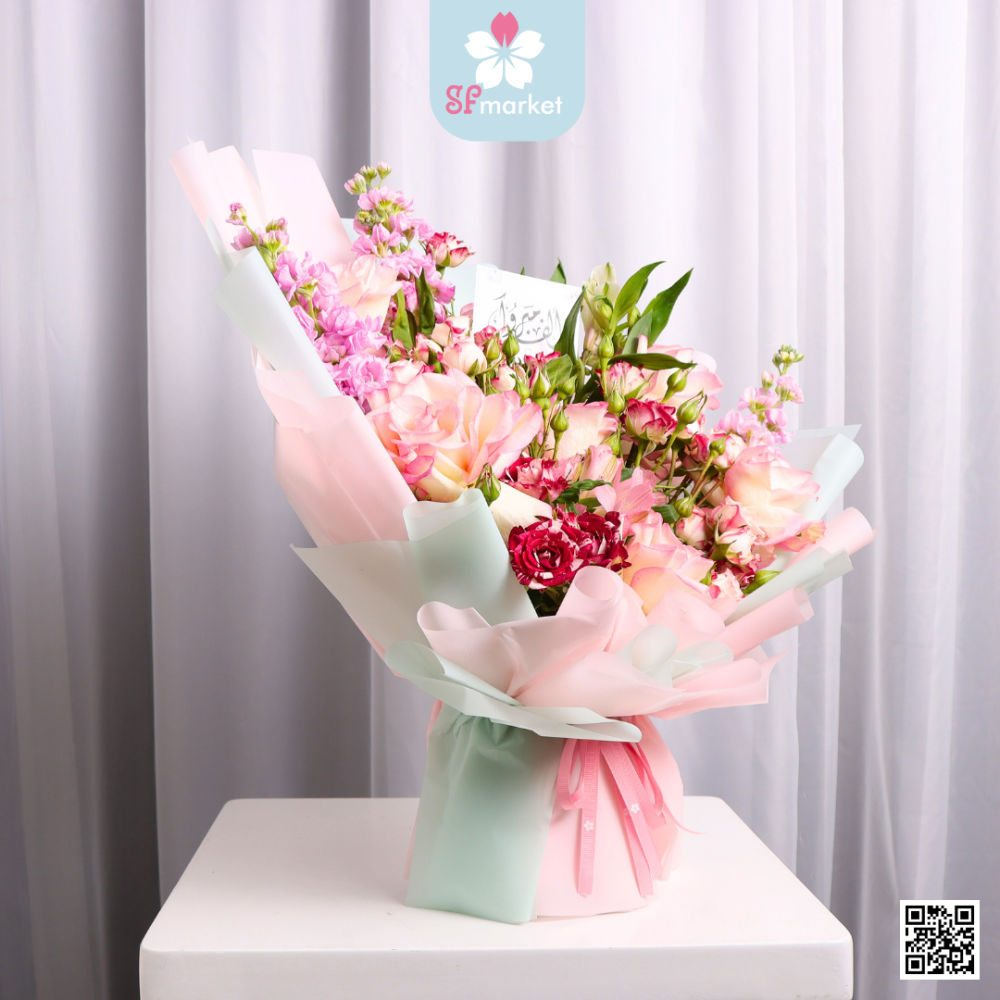 استمتع بلمسة من الجمال والأناقة مع باقة ورد طبيعي مناس اف ماركت. تأتي هذه الباقة في تغليف تول أبيض مميز، مع إمكانية إضافة هدية إضافية. وفي حالة عدم اضافة هدية يغلف الفراغ.