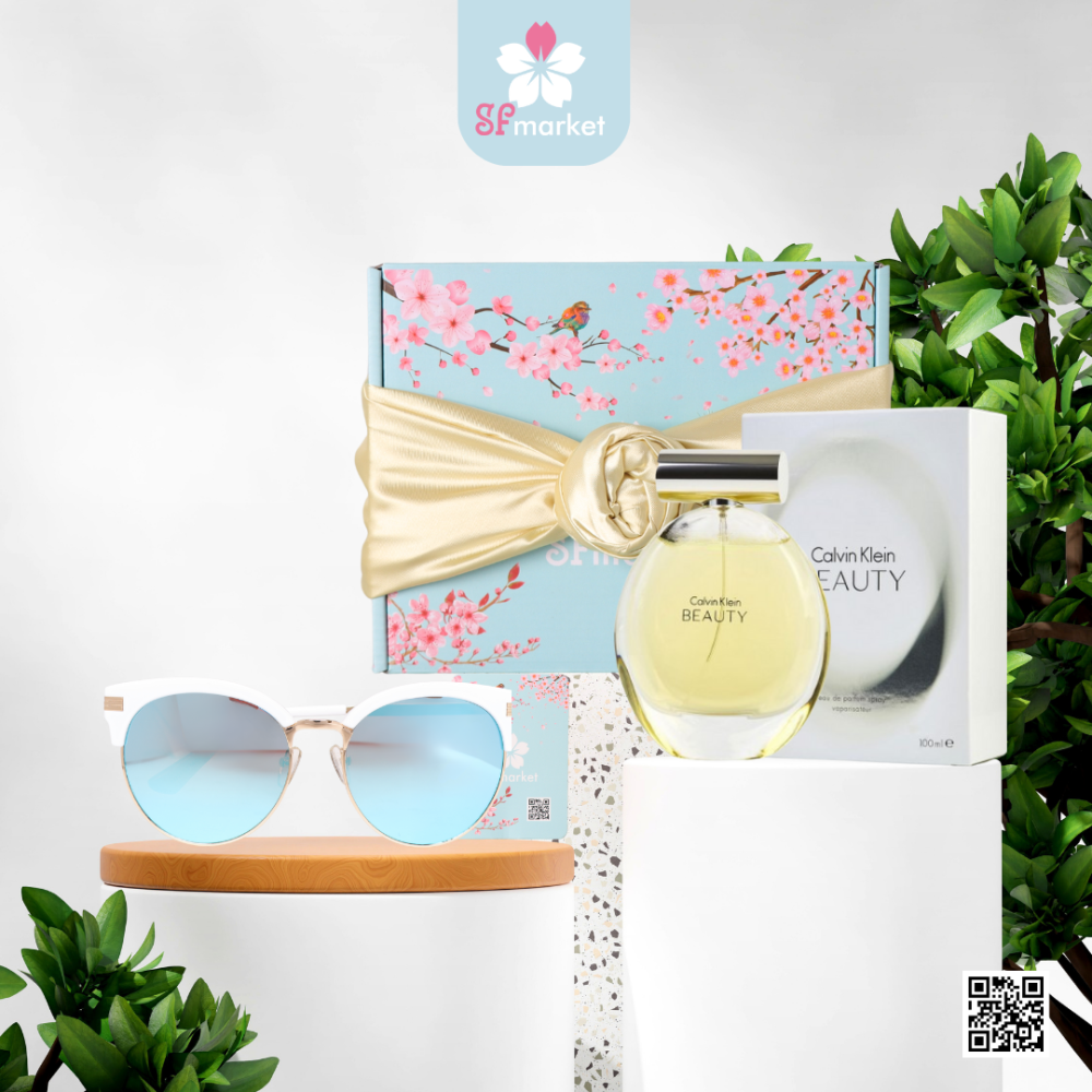 - عطر Calvin Klein Beauty Eau de Parfum: زجاجة عطر أنيقة بتصميم دائري ناعم، تحتوي على سائل عطري بلون ذهبي فاتح يعكس الرائحة الزهرية والأنثوية الجذابة. يأتي العطر في علبته البيضاء الأنيقة التي تكمل مظهره الراقي.