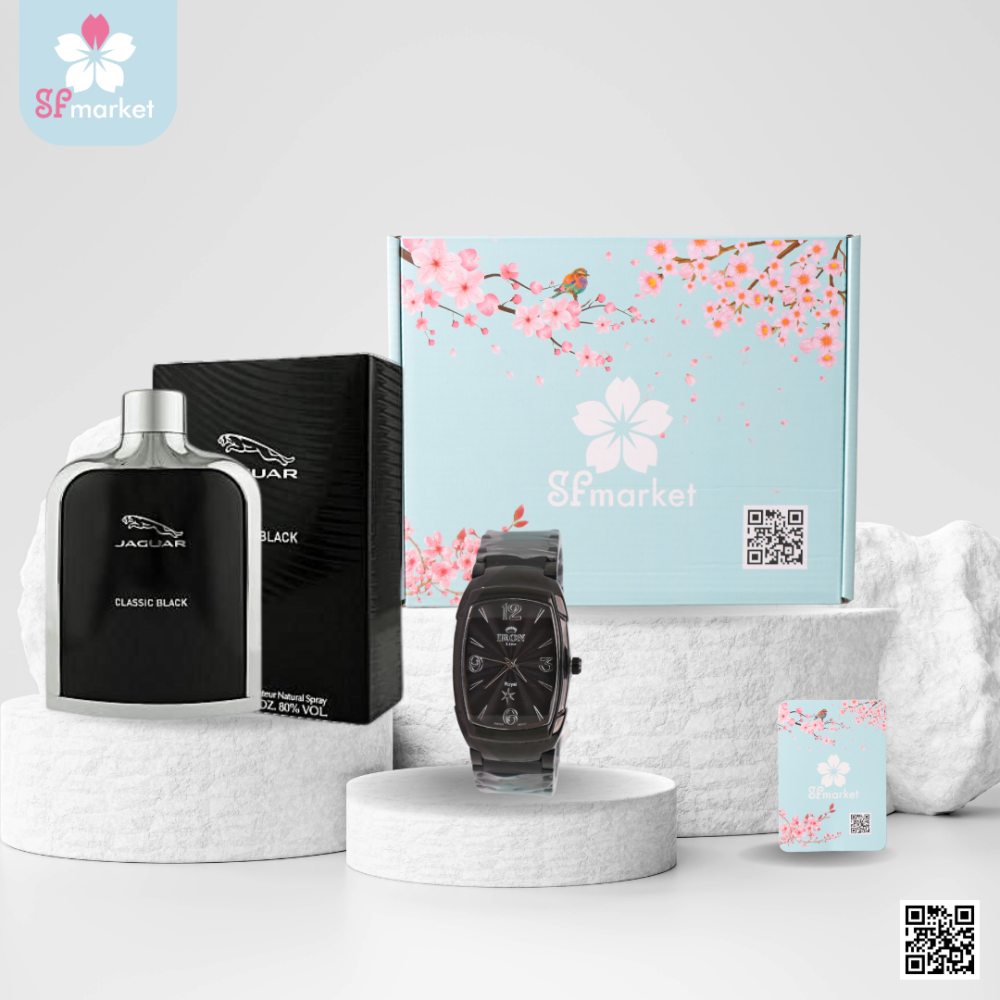 هدية فاخرة من إس إف ماركت! تحتوي هذه الباقة على بوكس فاخر يتضمن عطر جاكور كلاسيك الأسود الأصلي بحجم 100 مل، بالإضافة إلى ساعة من ماركة ايرون الراقية مع العلبة وضمان لمدة عام.