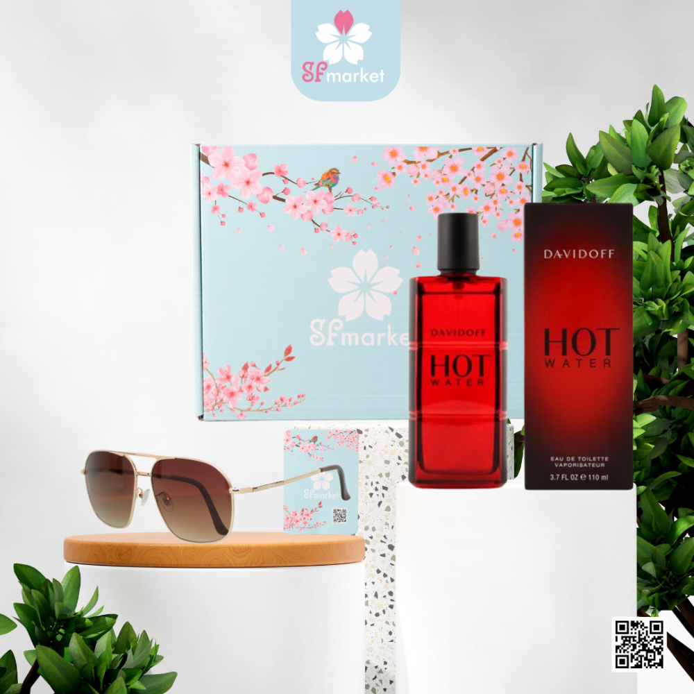 زجاجة عطر رجالي بتصميم جذاب باللون الأحمر الداكن الشفاف، بسعة 110 مل. تحمل الزجاجة اسم "HOT WATER" وشعار دافيدوف. العطر مصاحب لعلبته الكرتونية الأنيقة باللون الأحمر والأسود، والتي تعرض نفس اسم العطر وشعار العلامة التجارية، وتوضح أنه بتركيز "Eau de Toilette".